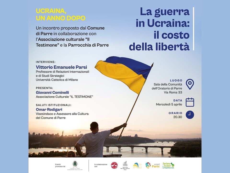 La guerra in Ucraina: il costo della libertà Mercoledì 5 aprile alle ore 20,30presso la Sala della Comunità dell’Oratorio di Parre Interviene VITTORIO EMANUELE PARSIProfessore di Relazioni Internazionali e di Studi Strategici Università Cattolica di… Leggi tutto »Conferenza con Vittorio Emanuele Parsi